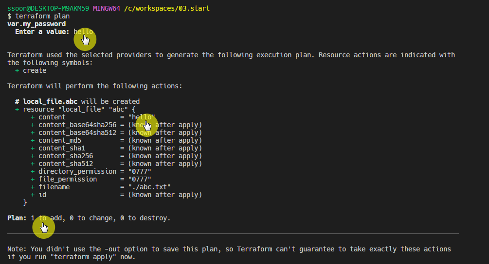 - terraform plan 실행 시 참조되는 변수 값 password 가 출력되지 않습니다.