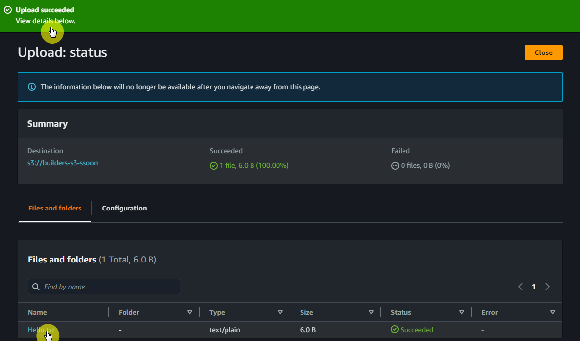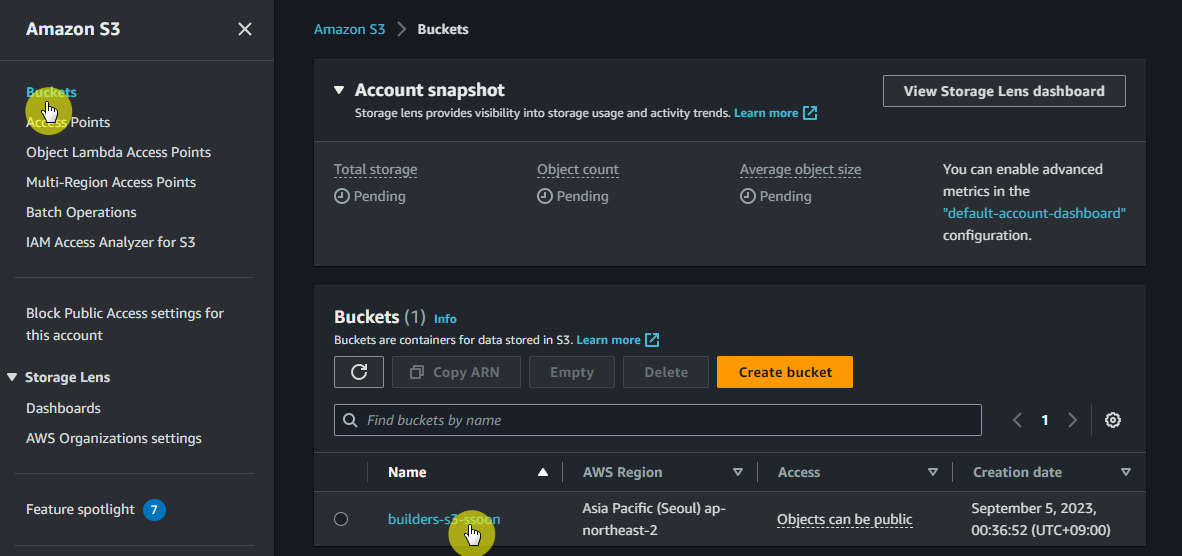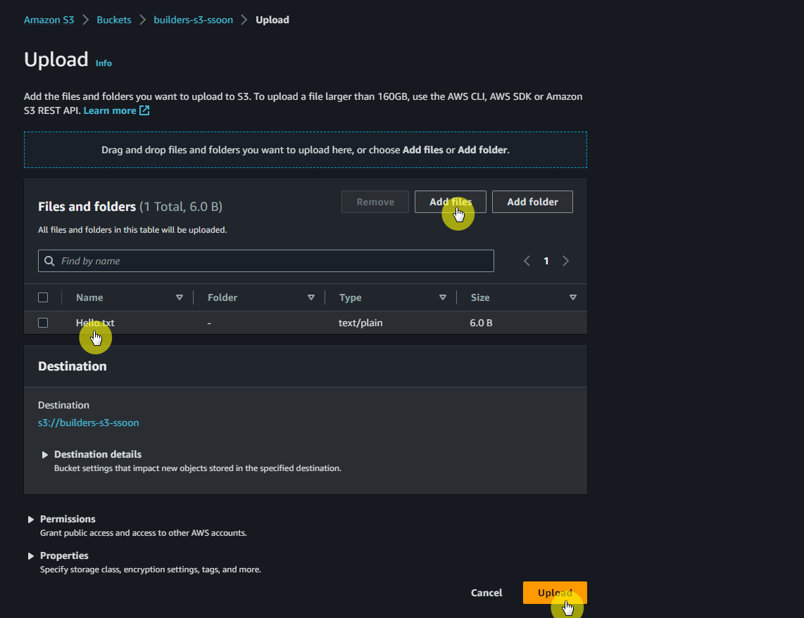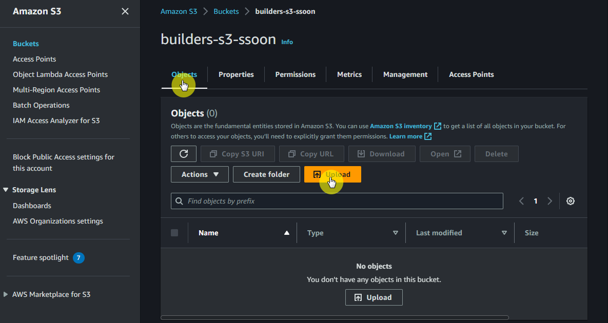 ✔ S3 > Buckets > 버킷이름 > Objects > Upload