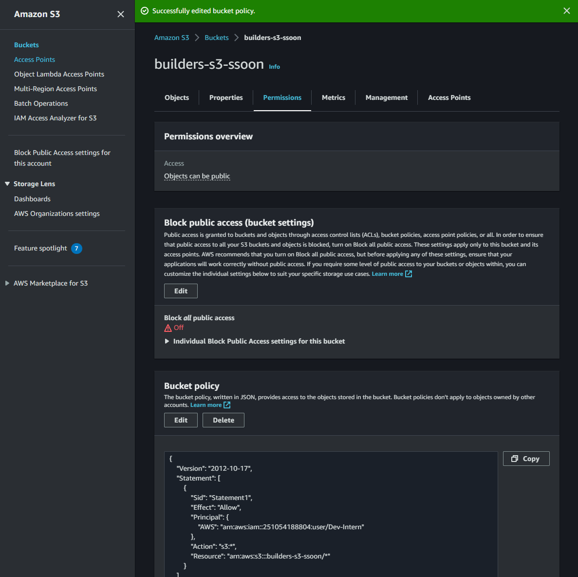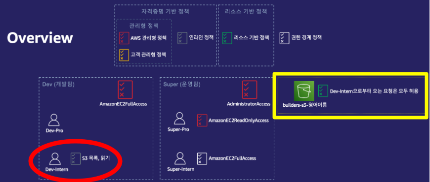 - S3의 리소스 기반 정책을 추가하여, Dev-Intern의 요청은 모두 허용하도록 설정