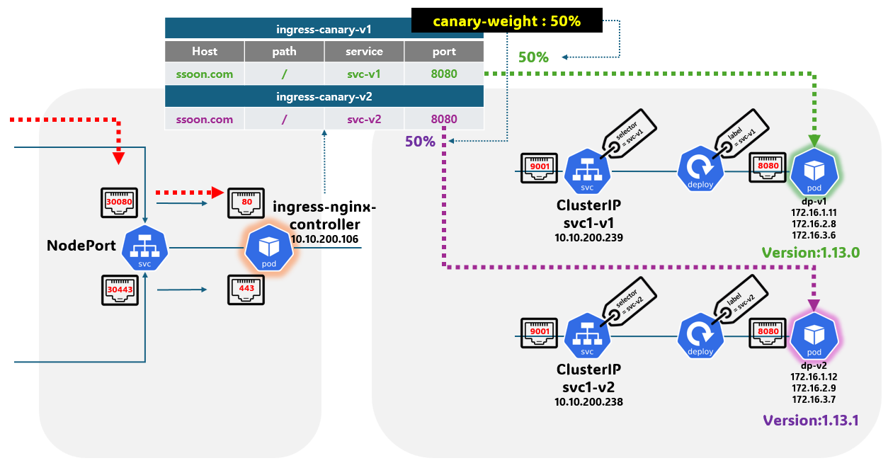 - 클러스터 외부에서 접근할 수 있는 포트를 제공합니다. 노드의 IP 주소와 함께 특정 포트(여기서는 30080과 30443)로 요청을 수신합니다.
