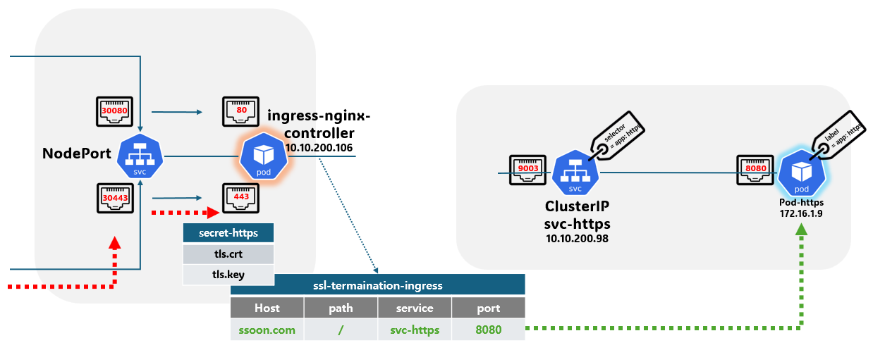 - 클러스터 내의 80 포트는 외부의 30080 포트로, 443 포트는 외부의 30443 포트로 노출됩니다. 즉, HTTP 요청은 30080을 통해, HTTPS 요청은 30443을 통해 받을 수 있습니다.