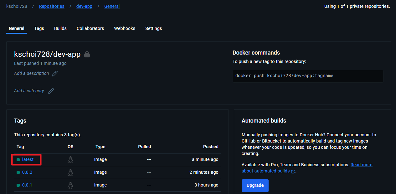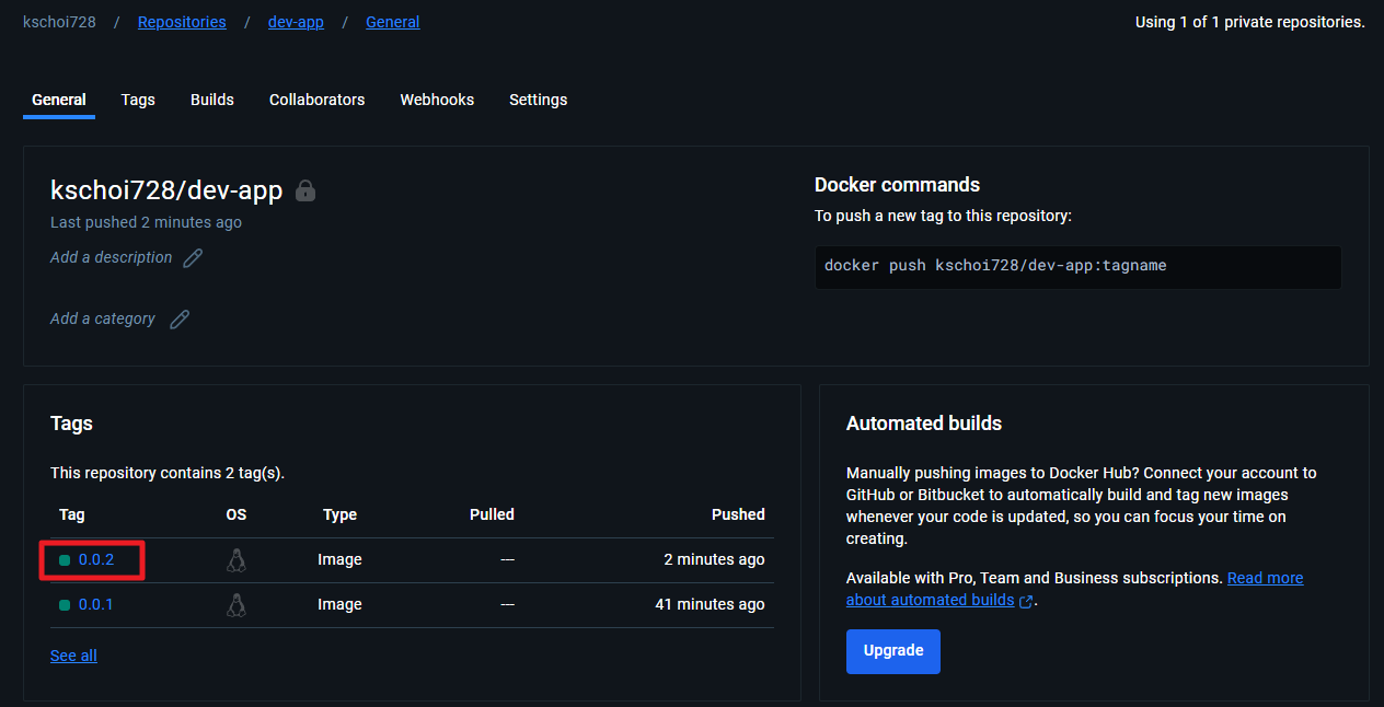 - Docker Build and Push: 설정된 태그를 사용하여 Docker 이미지를 빌드하고, Docker Hub로 이미지를 푸시합니다.