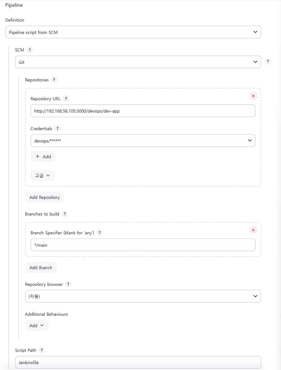 url: 'http://192.168.56.105:3000/devops/dev-app.git', // Git에서 코드 체크아웃