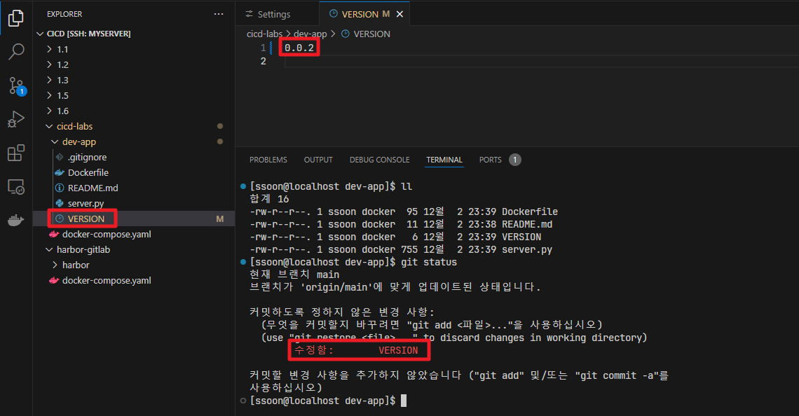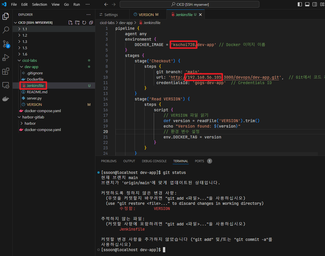 - 수정된 파일(VERSION) 과 추가한 파일(Jenkinsfile) 을 push 합니다.