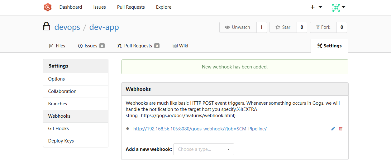 - Payload URL : http://192.168.56.105:8080/gogs-webhook/?job=**SCM-Pipeline**/