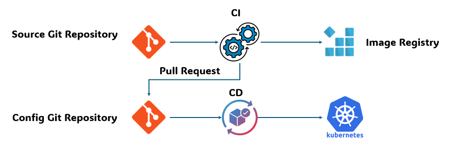 Kubernetes에서 GitOps 앱 배포는 최소 두 개의 Git 리포지토리를 사용합니다: 앱 소스 코드용 하나, Kubernetes manifests(Deployment, Service 등)용 하나.