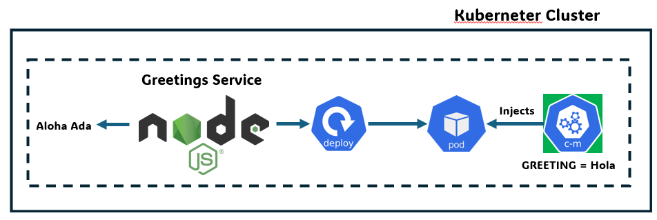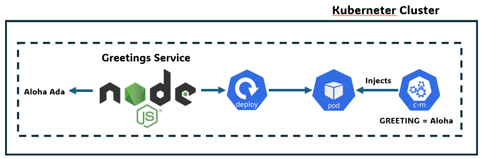 간단한 Node.js 애플리케이션이 있고, 이 앱은 ConfigMap에서 환경 변수(GREETING) 값을 가져와 인사 메시지를 반환합니다.