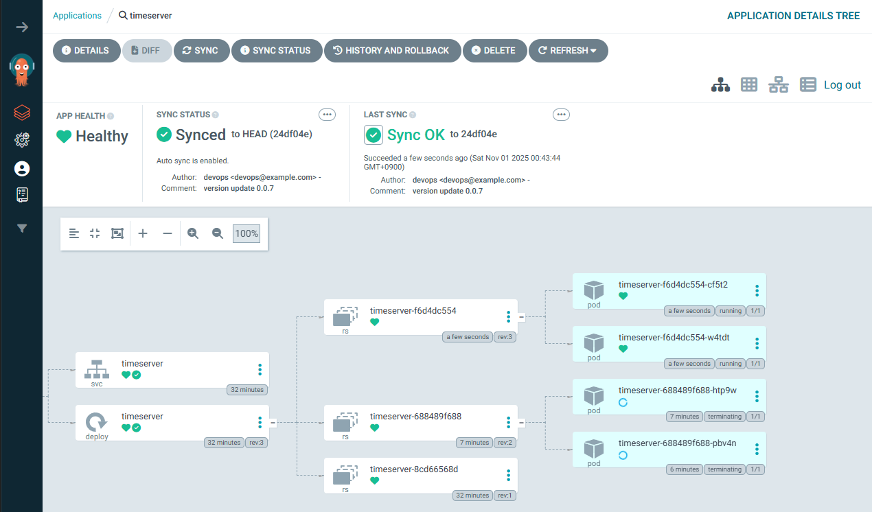 4️⃣ Full CI/CD 동작 확인 : Argo CD app Trigger 후 AutoSync 로 신규 버전 업데이트 진행 확인