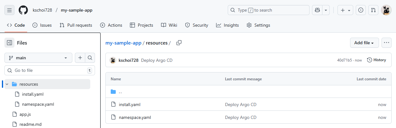 GitHub 리포지토리의 resources 디렉토리에 있는 Kubernetes 리소스를 Argo CD가 자동으로 동기화하여 argocd 네임스페이스에 배포하도록 설정한 Application 리소스를 생성