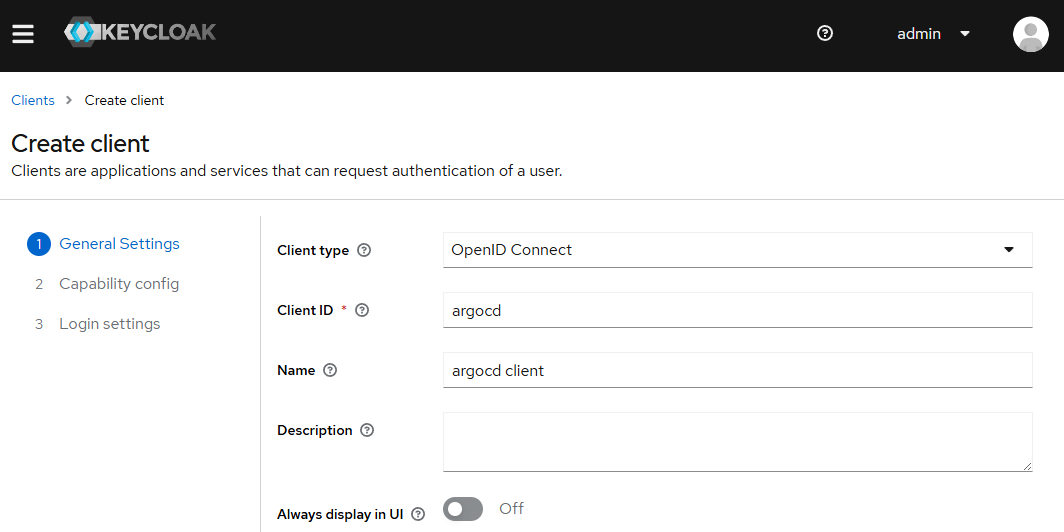 argocd client | Keycloak 관리자 콘솔 등 UI에 표시될, 사람이 읽기 쉬운 이름입니다. |