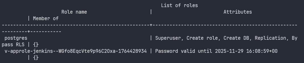 - Password valid until 2025-11-29 16:08:59+00 → TTL 기반, 만료 후 자동 삭제